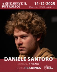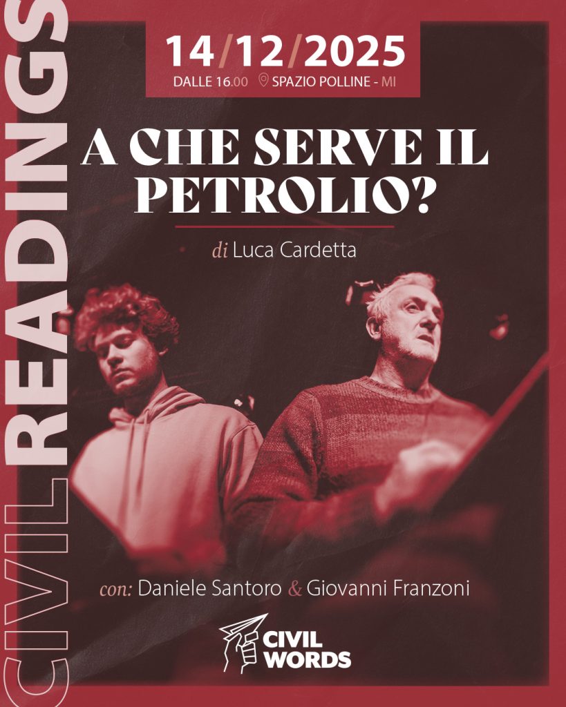 In un mare fatto di attese e silenzi che nessuno dei due sapeva nominare, l’incontro tra il ragazzo e l’adulto diventa una macchia di petrolio: un’ombra che si espande in ciascuno di loro, cambiando per sempre ciò che credevano di essere. La lettura scenica si terrà domenica 14 dicembre alle ore 16:00 presso Spazio Polline – Milano.